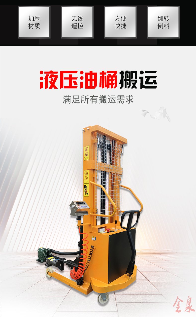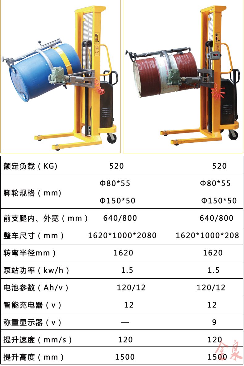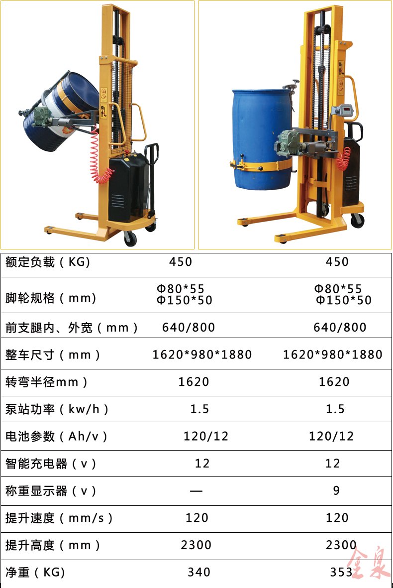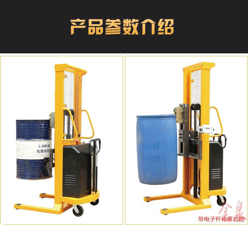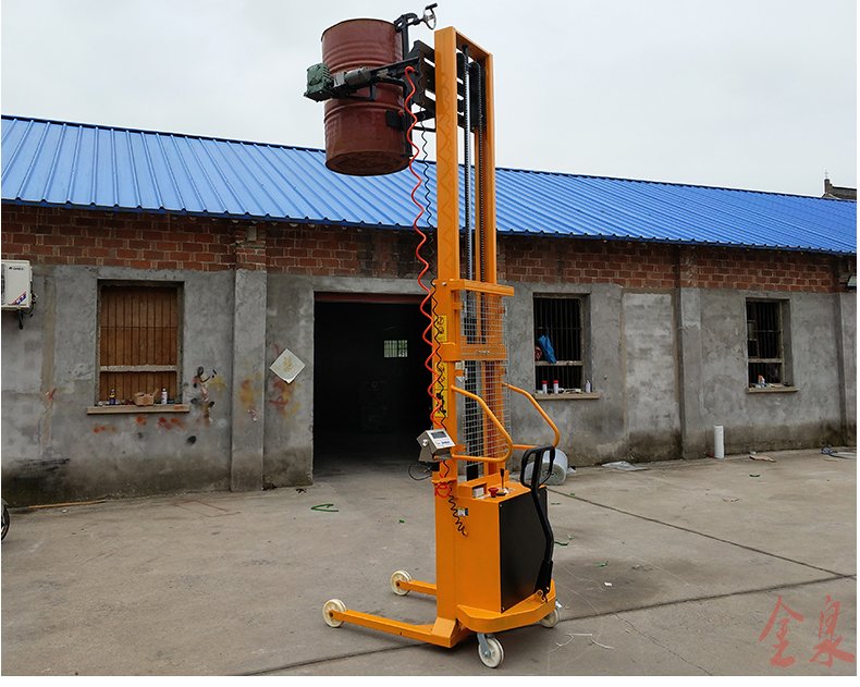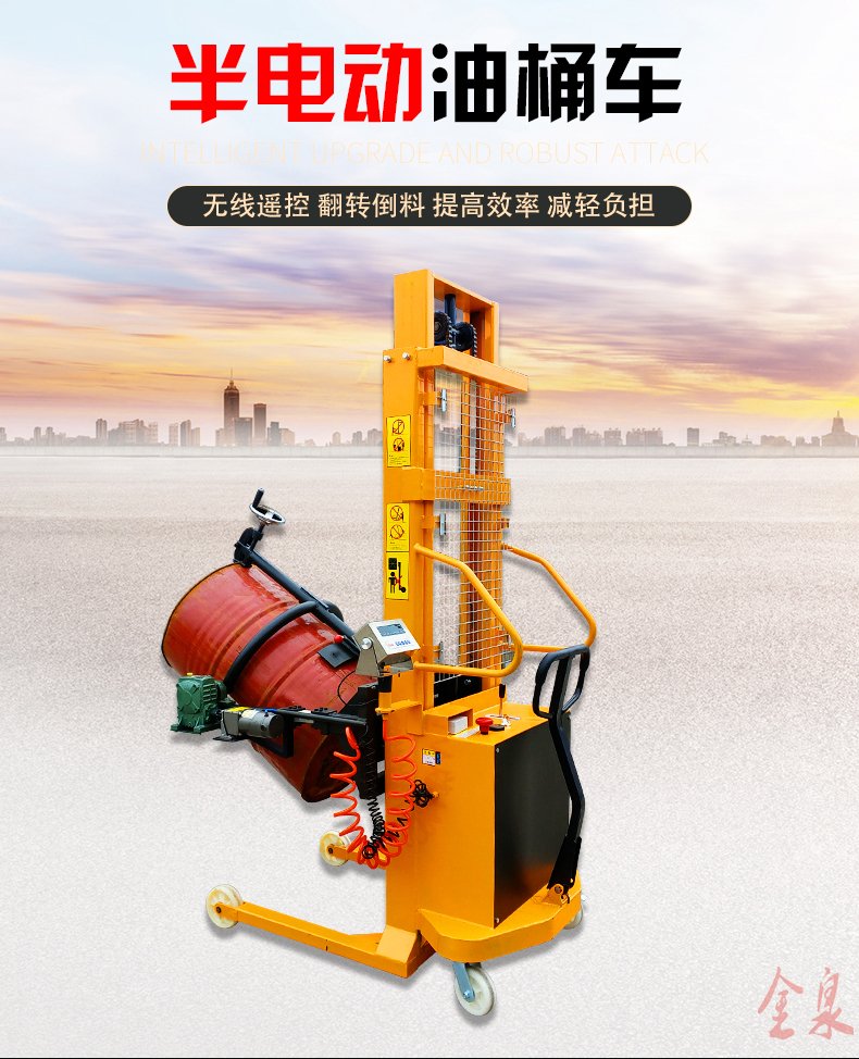 COTO翻轉(zhuǎn)式半電動(dòng)油桶裝卸倒料車為手推行走、電動(dòng)升高、翻轉(zhuǎn)方式可選為(手動(dòng)式或電動(dòng)式) 最大起升重量350Kg,起升高度1500-4500mm,前輪使用180MM直徑大輪,使手推行走更省力。該油桶車在空中可利用減速機(jī)作180-360度旋轉(zhuǎn),兼有手動(dòng)堆高車和油桶搬運(yùn)車雙項(xiàng)特點(diǎn),桶夾臂上端為鷹嘴機(jī)構(gòu),可牢固夾持油桶上沿,中間為手臂形夾臂,底部有一個(gè)拖舉裝置。電動(dòng)油桶搬運(yùn)裝卸車適合食品、油制品等流質(zhì)的裝卸及倒料或攪拌,在搬運(yùn)的同時(shí)可稱出產(chǎn)品的重量。可傾式半電動(dòng)油桶裝卸車大大提高效率,無噪音無污染。油桶夾有上下夾頂式和左右環(huán)抱式,晚上充電白天使用8小時(shí)以上。廣泛應(yīng)用于涂料油墨、膠粘劑、染料、顔料、農(nóng)藥、造紙、皮革、石油化工、碳酸鈣等行業(yè)。